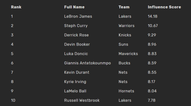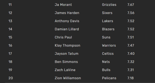 以下是前10位的具体排名:1.詹姆斯(14.18)、2.库里(10.67)、3.罗斯(9.29)、4.布克(8.96)、5.东契奇(8.83)、6.字母哥(8.59)、7.杜兰特(8.55)、8.欧文(8.17)、9.三球(8.04)、10、威少(7.78)