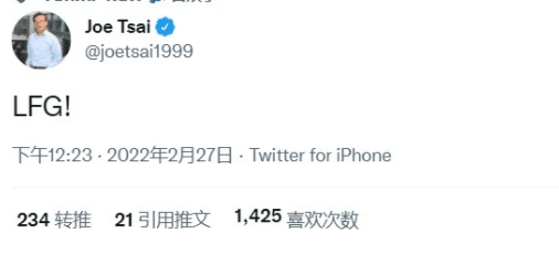 篮网老板蔡崇信也一直关注着比赛,赛后他更新社交媒体,写道:“LFG!(让我们TMD去吧!海外社交媒体常用的鼓励短语)”