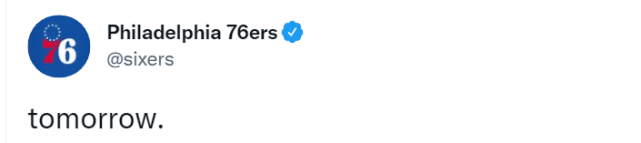 76人官方先后晒出了哈登的训练照和侧面照,并配文:“明天”。美媒也回顾了76人队史上7大球星的首秀,为哈登的首秀预热——