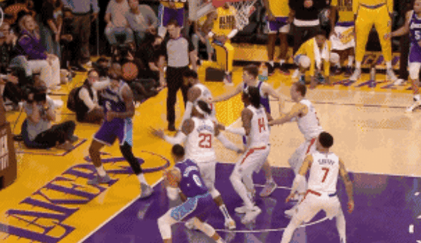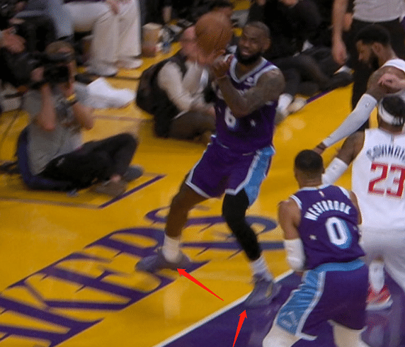 这是比赛进行到末节还剩下24.5秒的时候,威少上篮没有投进,詹姆斯想要补篮,结果没有拿住,落地后的争抢出界。裁判回看很长的时间,最终的判罚结果是快船挑战成功,是詹姆斯的脚出界之后传球,等于是詹姆斯的失误,球权转换给快船,这个时候湖人落后1分,时间还有24.5秒。