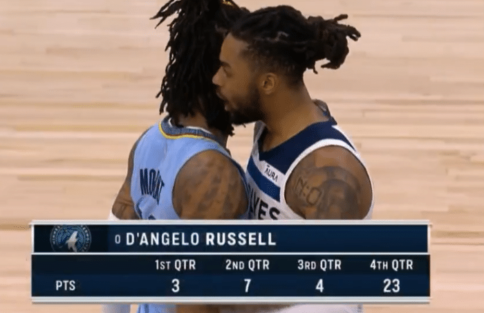 整个第四节,拉塞尔独得23分,投篮12中8。全场比赛,拉塞尔拿下了37分9助攻,可以说凭借一己之力,帮助森林狼完成了一场15分的大逆转。这也是森林狼本赛季完成的最大逆转。赛后,拉塞尔和莫兰特拥抱致意,莫兰特也给前辈送上了祝贺。