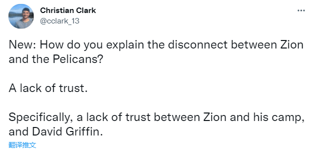 鹈鹕球星锡安离队治疗的一大原因曝光,据鹈鹕记者Christian Clark报道,锡安离队处理伤病是因为他信任大卫-格里芬,锡安方面更是认为大卫-格里芬不会说实话。