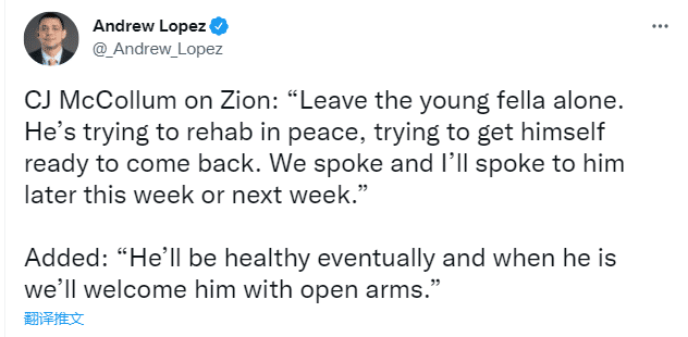 来源:JRS直播网02-25 15:33JRS直播网02月25日讯 ,鹈鹕新援CJ-麦科勒姆谈到外界对锡安的批评,他表示:别再影响这个年轻人了。他正在尝试平静地康复,试图让自己做好回归的准备。我们谈过了,我将在本周晚些时候或下周和他谈;他最终会健康的,当他健康的时候,我们会张开双臂欢迎他。