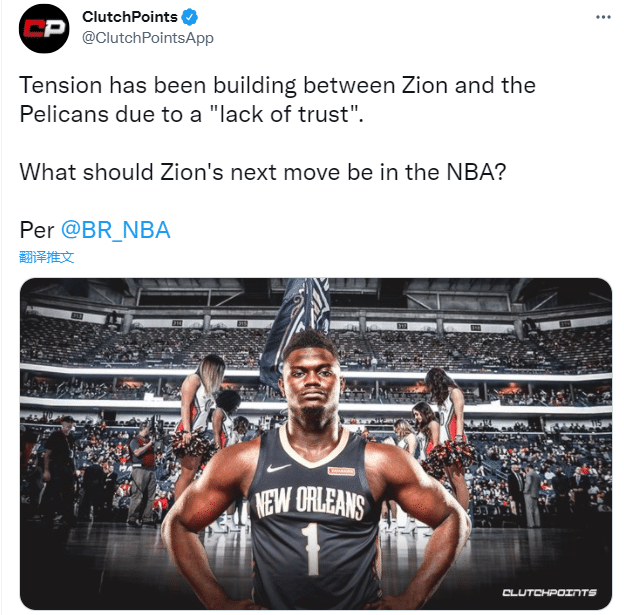 锡安和鹈鹕之间的不和已经由来已久,美媒Clutchpoints发推写道,由于缺席信任,锡安和鹈鹕之间的关系一直很紧张,锡安在NBA的下一步应该是什么?
