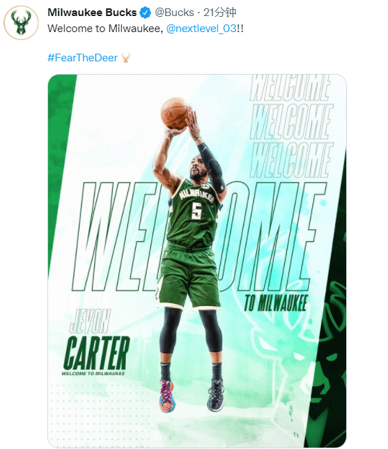 雄鹿官方正式宣布,他们已经签下杰文-卡特,并且发推写道:欢迎来打密尔沃基;雄鹿还宣布卡特将身穿球队的5号球衣,他曾穿过灰熊3号、太阳4号和篮网0号;卡特被裁后,篮网中锋德拉蒙德火速换号,把4号换成0号。