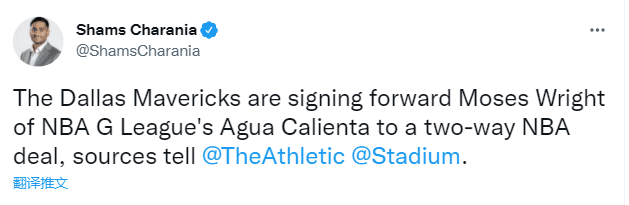 据名记shams报道,独行侠将与发展联盟锋线球员摩西-赖特签下一份双向合同;赖特今年23岁,身高203cm,体重103公斤,司职前锋;曾和快船签下10天短合同,出战一场仅打1分钟;在发展联盟,赖特场均拿到17.6分8.8篮板1.9助攻1.9盖帽。