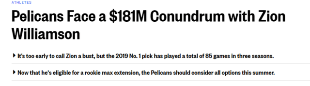 2021-22赛季是锡安新秀合同(4年4430万美元)的第三年,今年夏天他有资格提前续签一份5年1.81亿美元的顶薪合同(平均年薪3120万美元)。如果双方未能达成续约,锡安将在2023年成为一名受限制的自由球员。届时,他可以和鹈鹕签一份1年1760万美元的资质报价,并在2024年成为完全自由球员。