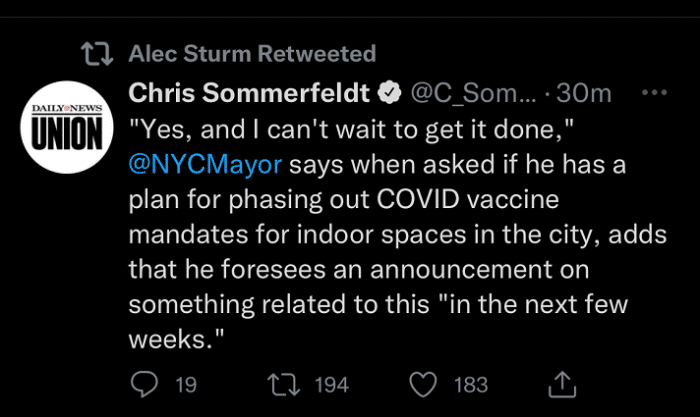 值得一提的是在前段时间纽约市长接受采访的时候,他就明确表示对于纽约防疫政策有些不公平,称“我认为它不公平。客场球员可以来纽约打球而主场球员不行,我觉得这不公平。我不确定这个规定是不是一位波士顿球迷设立的。”