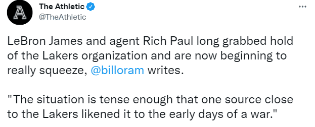 最近一段时间,关于詹姆斯和湖人不和的言论很多,湖人记者Bill Oram透露詹姆斯强迫湖人交易,他在队内的影响力早已超越当年的科比;湖记还透露詹姆斯和他的经纪人里奇-保罗长期以来一直控制着湖人,目前双方局势非常紧张,一名内部人士将其比作是一场战争的初期。