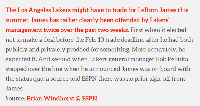 ESPN名记Windhorst更是直言湖人今夏可能不得不交易詹姆斯;此前Windhorst曾报道詹姆斯对湖人在交易截止日没有达成任何引援很不满,全明星赛期间,詹姆斯公开表示重返骑士的大门从未关闭以及生涯最后一年只想和布朗尼并肩作战,这便是他对球队不满的一种方式。