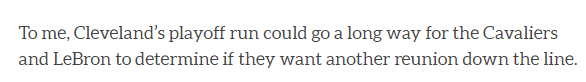 在今年克利夫兰全明星赛期间,詹姆斯公开表示他重返骑士的大门还没有关闭;詹姆斯重返克城仍是这座城市最受欢迎的巨星,无数骑士球迷都希望詹姆斯能重返骑士,带队再夺一冠;如今美记者爆料,骑士季后赛的表现是詹姆斯重返骑士的关键因素。