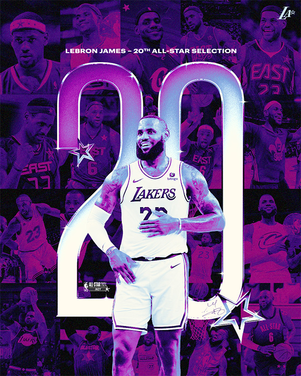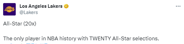湖人官方第一时间祝贺詹姆斯,晒海报并且发推写道:20次全明星,NBA历史上唯一一位20次入选全明星的球员;赛季至今,詹姆斯场均上场34.3分钟能够拿到24.8分7.2篮板7.4助攻1.3抢断,39岁仍旧打出不可思议的表现。
