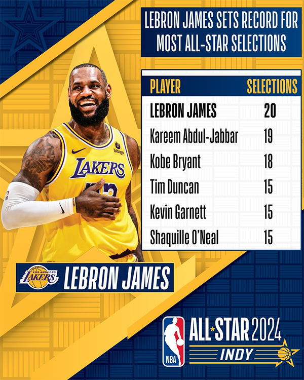 39岁詹姆斯的全明星总票数领跑西部,再次成为西部全明星阵容的队长,职业生涯第20次入选全明星阵容连创历史第一纪录——连续20年全明星首发刷新历史第一纪录,第20次入选全明星超越贾巴尔成为史上入选全明星次数最多的球员。
