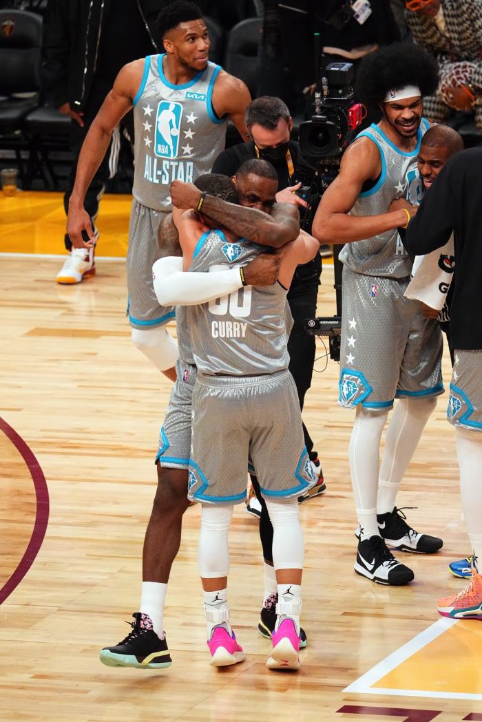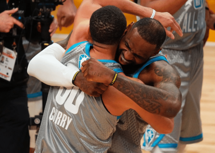 全明星赛最后时刻,詹姆斯队161-160领先杜兰特队1分,詹姆斯迎着拉文和恩比德的防守投进不讲理中投,翻身后仰跳投终结比赛;詹姆斯第一时间和德罗赞撞胸庆祝,与字母哥等人庆祝后老詹紧紧拥抱库里,此时库里情不自禁地踮起脚后跟,与老詹抱在一起。