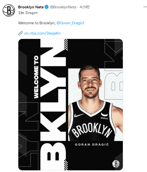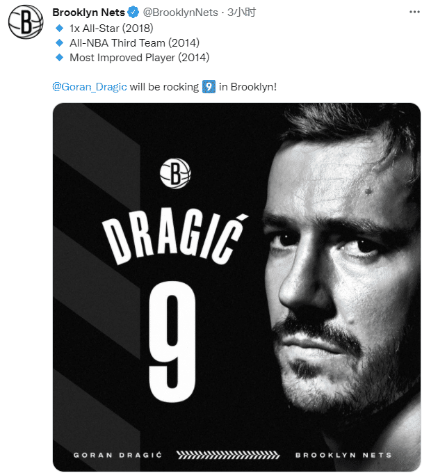 篮网官方晒照欢迎德拉季奇来到布鲁克林,晒出德拉季奇生涯荣誉——2018年入选全明星,2014年入选最佳三阵和2014年获得年度进步最快球员奖;德拉季奇将身穿篮网9号球衣开启生涯新篇章。