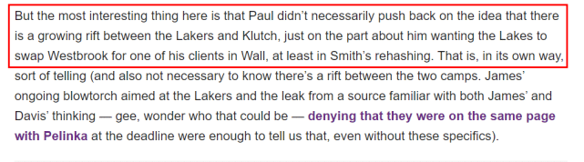昨日,Bleacher Report记者Eric Pincus报道称,Klutch对湖人总经理佩林卡不满,而且这种情绪由来已久。最近这一情绪达到沸点,因为佩林卡拒绝用威少+未来的一个首轮签去换回沃尔,而沃尔恰恰是Klutch的客户之一。Eric Pincus还表示,詹姆斯和湖人的“婚姻”关系已经岌岌可危。