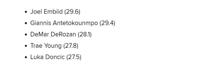 得分王更可能在恩比德和字母哥之间产生。与之前的原因一样,哈登在全明星后的复出,应该会减少恩比德的出手数,他的得分产量也有可能下降。相比之下,字母哥在雄鹿的地位无法撼动,战术都围绕他来制定,美媒预测他有望拿到生涯第一个得分王。