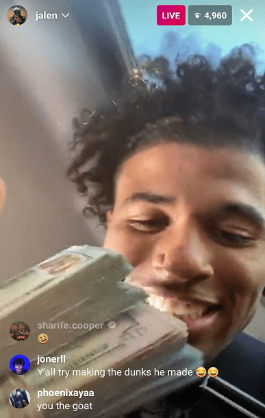 来源:JRS直播网02-22 11:50JRS直播网02月22日讯杰伦-格林没有比赛任务,在度过了全明星周末之后,杰伦-格林开启了直播,只见他手拿大沓现金炫富。直播中的杰伦-格林非常开心,有数千人观看这位火箭榜眼的直播。