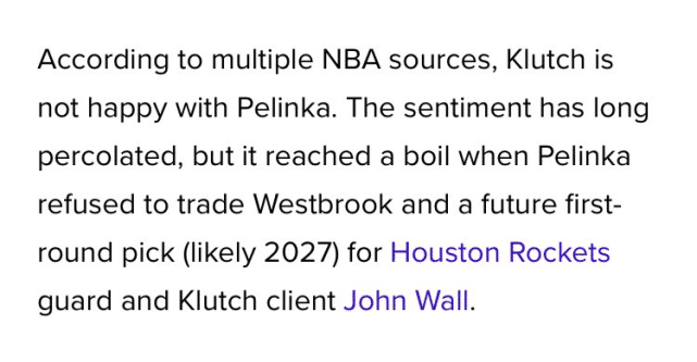来源:JRS直播网02-21 19:18JRS直播网02月21日讯 ,据Bleacher Report名记Eric Pincus报道,多个消息源透露,Klutch(詹姆斯所在的经纪公司)对佩林卡感到不满,原因在于佩林卡拒绝用威少和一个未来的首轮签(很可能是2027年)去换回火箭后卫约翰-沃尔,而沃尔恰恰也是Klutch的签约客户。