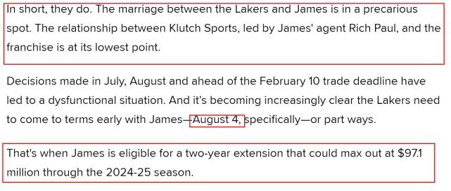 Eric Pincus指出,这些信息都意味着詹姆斯和湖人的“婚姻”已经岌岌可危。以詹姆斯经纪人里奇-保罗为首的Klutch公司和湖人的关系也已降至最低点。别忘了戴维斯的经纪公司也是Klutch,他最早可以在2024年跳出合同,如果湖人和Klutch的关系无法修复,他们也可以考虑通过交易送走詹姆斯和浓眉,但这要牵扯的问题就更多了。