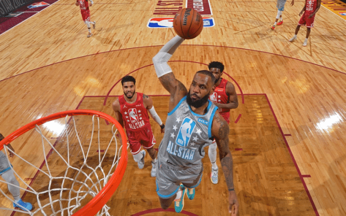 第二节,杜兰特队率先加强防守,一波攻势反超比分,詹姆斯队首发重新上场,老詹再次暴扣以及接约基奇助攻完成空接暴扣,此节库里手感炸裂,单节投进6记三分独砍18分,看到库里手感滚烫,老詹助攻为库里传球,半场大战詹姆斯队93-94落后1分。
