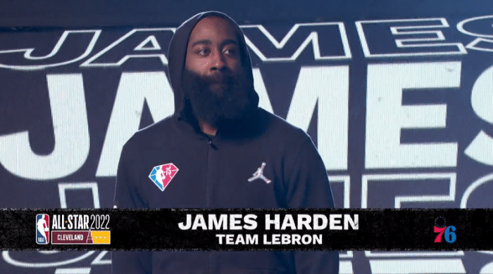 哈登亮相时,骑士主场响起响亮的嘘声;目前哈登已经是一名76人队球员,此前他和篮网之间的离队事件引发巨大争议;赛前,哈登来到杜兰特更衣室,和恩比德拥抱寒暄;哈登还参加75大球星合影,以及和76人名宿艾弗森合照。