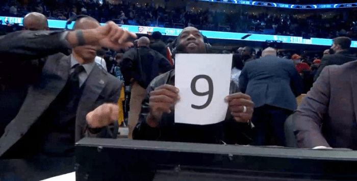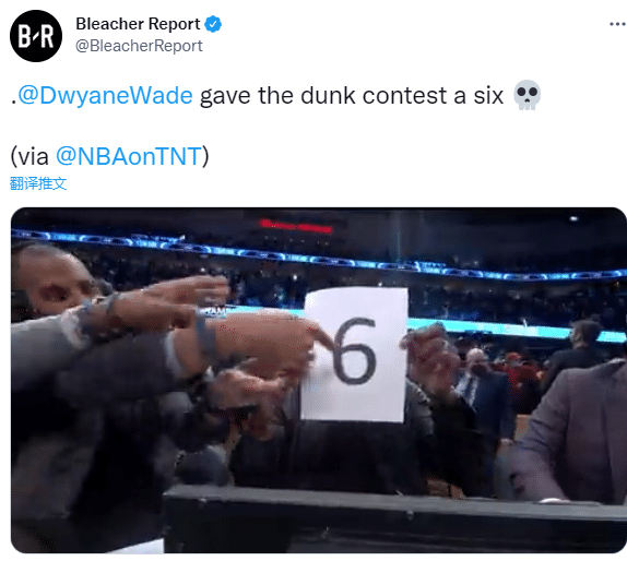 扣篮大赛结束后,镜头给到场边,韦德先是举着9分,然后把纸翻转过来,给这届扣篮大赛仅打6分,雷吉-米勒等人指着6分,随后韦德咧嘴哈哈大笑;韦德玩9分梗,最终给扣篮大赛打6分,今年真该让韦德继续当评委,估计他的表现会比球员的扣篮更精彩。