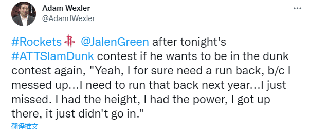 顺便提一下,杰伦-格林表态想要明年继续参加扣篮大赛,赛后表示:我以后肯定还会参加扣篮大赛,因为这次我搞砸了,明年我还想继续参加;我的扣篮有足够的高度和力量,只不过今晚没能将球扣进。
