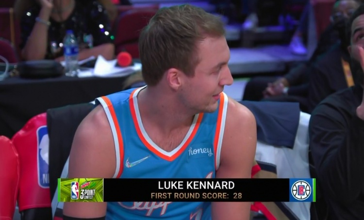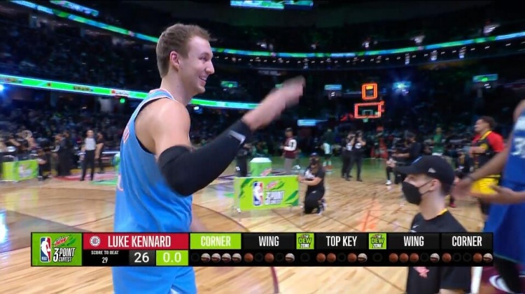 第三个出场的是卢克-肯纳德,第一个点投进2球拿到3分,第二点也拿到5分,弧顶处全部命,最后彩球车进入4球,共拿到28分。