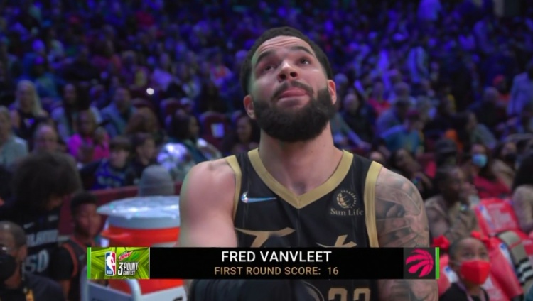 第七个出场的是弗雷德-范弗利特,第一个点投进3球拿到4分,花球车放在第二个点投进2个,而2个超远全部投丢,共拿到16分。