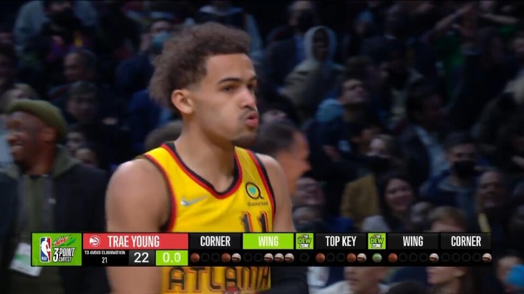 第二位出场的是特雷-杨,他开局手感不佳,但是随后找到手感,无奈唐斯分数过高,他最后得到了26分。