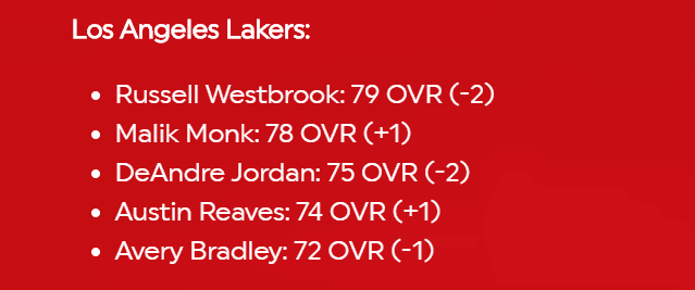 先来看看湖人,5名球员的数值发生变化。威少降了两个点,最新数值只有79。威少本赛季表现糟糕,特别是命中率和失误问题一直存在,跌破80大关也不会让人感到很意外。同样降了两个点的还有小乔丹,小乔丹已经掉出轮换,最新数值是75。此外,布拉德利下降1点,最新数值72,而近来状态不错的里夫斯和蒙克都增加了1个点,里夫斯是74,蒙克是78。