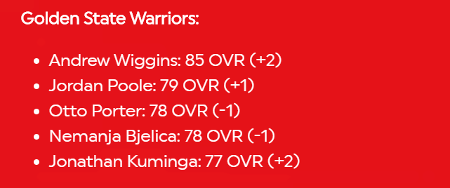 再来看看勇士,也有5名球员的数值发生变化。入选全明星的维金斯增加两个点,达到85,年轻的库明加也增加两个点,来到77。普尔提升1点,来到79,波特和别利察各下降1个点,同为78。