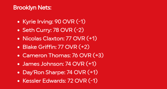 最后看看发生交易的篮网和76人。篮网8人数值变动,只能打客场的欧文,下降1点,来到90。塞斯-库里加盟篮网后表现不错,但他的最新数值却下降了两个点,来到78,爱德华兹也下降1点,来到72。除了这三位,篮网其他5人都是上升,克拉克斯顿和格里芬升至77,詹姆斯-约翰逊和夏普升至74,上升幅度最大的是新秀托马斯,他提升3个点,来到76。逆转尼克斯一战,托马斯末节轰下16分,技惊四座!