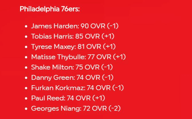 76人方面多达9人发生变动。哈登和欧文一样,降了1个点,最新数值90。米尔顿、丹尼-格林、科尔克马兹、尼昂都下降了,上升的包括哈里斯、马克西、塞布尔、里德。哈里斯最新85,马克西最新81。