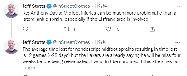 医学运动专家Jeff Stotts发推写道,浓眉中足扭伤,平均缺席28天休战12场比赛,中足扭伤比脚踝外翻扭伤更成问题,尤其是涉及到跖跗关节区域的情况下;湖人队已经表示重新评估前缺席四周,如果他缺席很久,我不会感到惊讶。