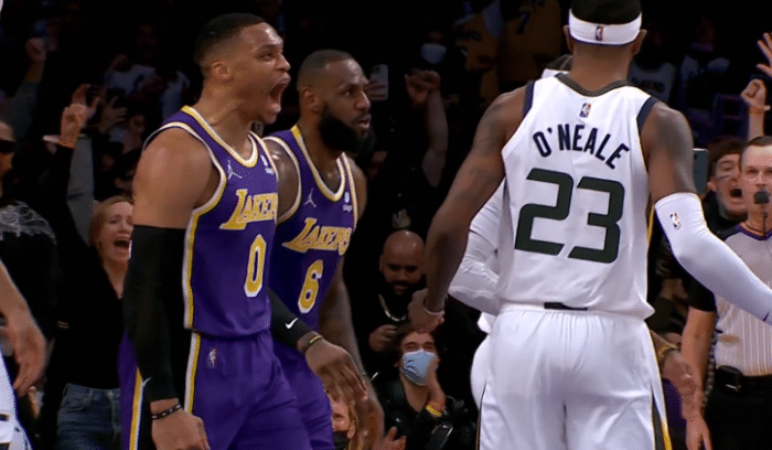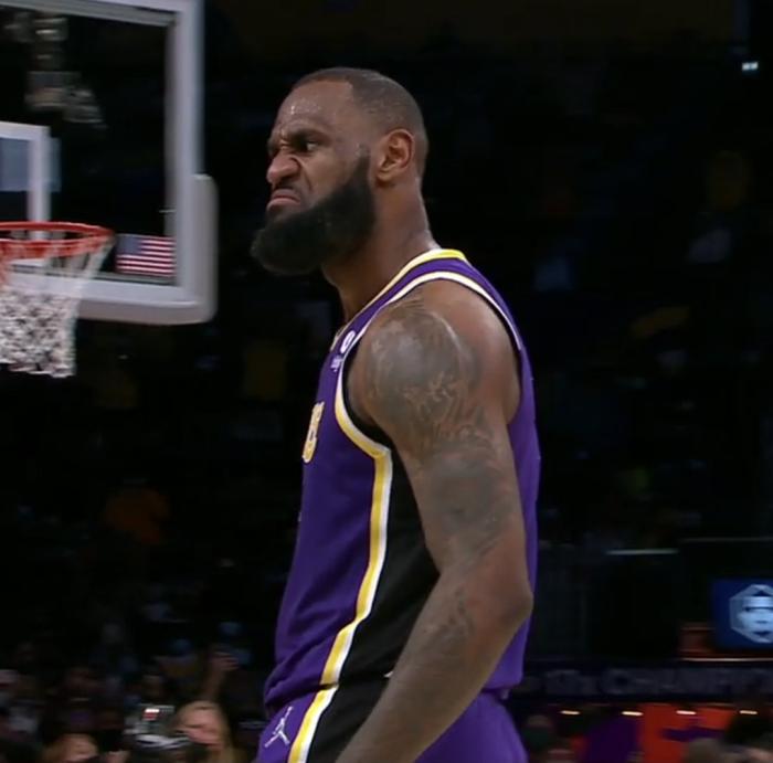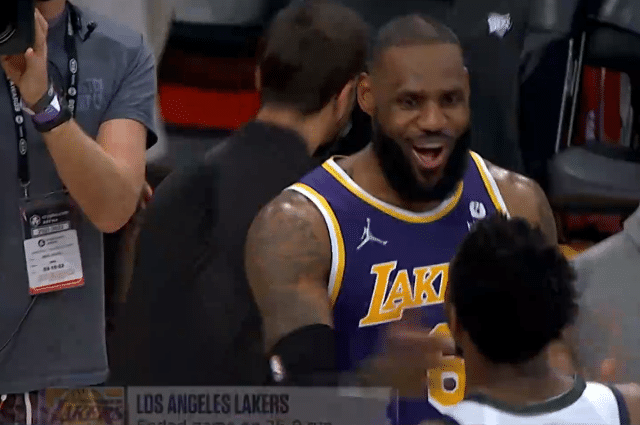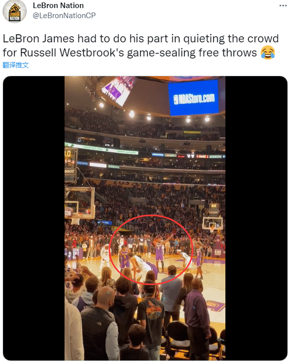 真领袖!老詹示意球迷别影响威少罚球,湖人赢球后大笑拥抱米切尔