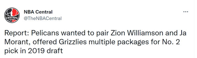 Clark报道称,鹈鹕在那年选秀大会上拥有状元签和4号签,他们提供给灰熊的多份报价方案里,就包含那个4号签,但他们的所有方案都被灰熊拒绝了。“如果灰熊当初接受了鹈鹕的任何一份报价方案,现在,锡安和莫兰特就是鹈鹕队友了,不过,灰熊非常明智地守住了他们的榜眼签。”