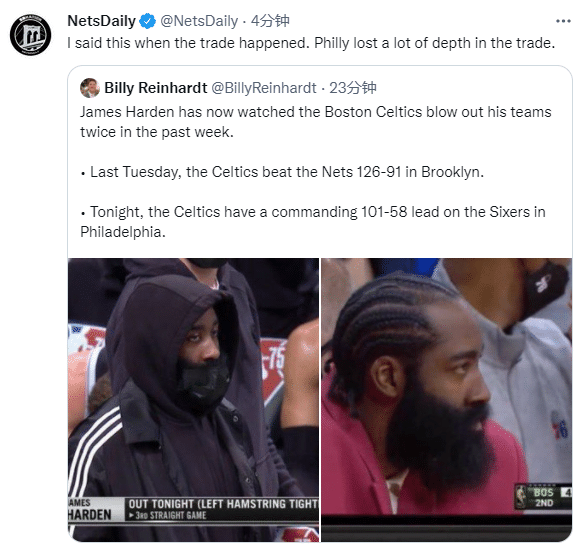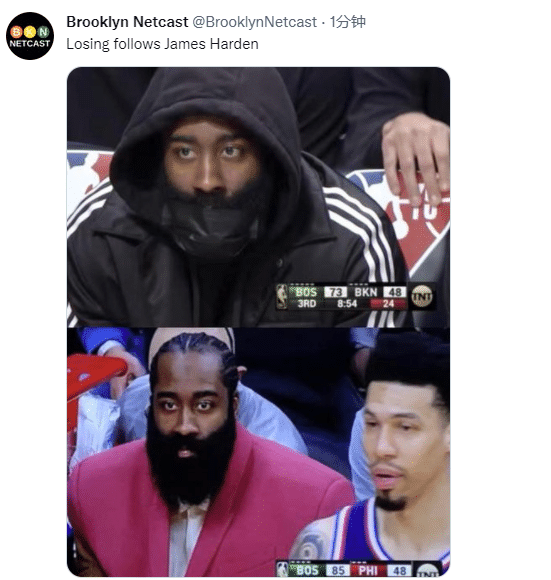 篮网媒体brooklyn Netcast晒哈登表情对比图,发推写道:失利跟随着哈登;篮网记者Billy发推写道:詹姆斯-哈登现在已经看到波士顿凯尔特人队在过去一周两次击败他的球队——上周二,凯尔特人队在布鲁克林以126-91 大胜篮网35分;今晚凯尔特人队在费城以101-58 领先76 人43分,本场比赛76最终惨败48分。