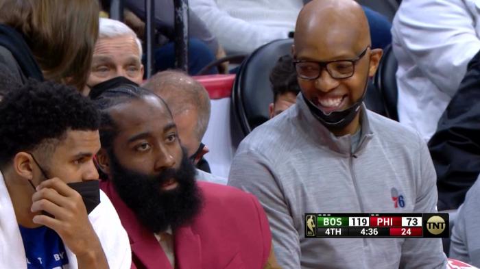 76人惨败助教却大笑!哈登生无可恋表情遭群嘲:一周两次惨败绿军