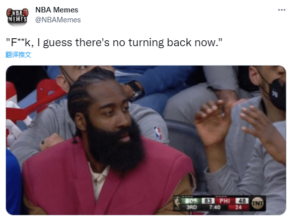 美媒NBA Memes晒哈登沮丧表情,配文猜测哈登的内心想法,发推写道:FxxK,我猜现在已经没有回头路了。