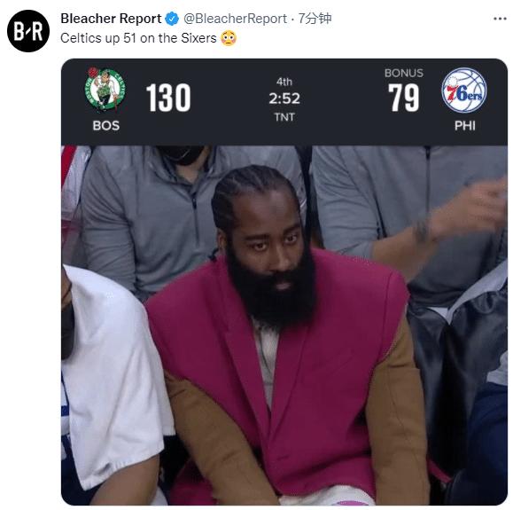 美媒B/R露天看台晒图发推写道:76人落后凯尔特人51分。