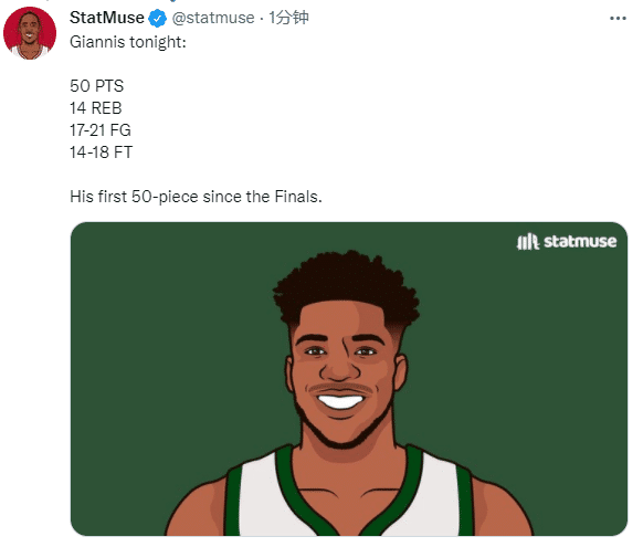 第二、字母哥生涯常规赛第3次50+,与布克、汤普森等现役球星以及伯德、韦德、摩西-马龙等名宿并列历史第30位。