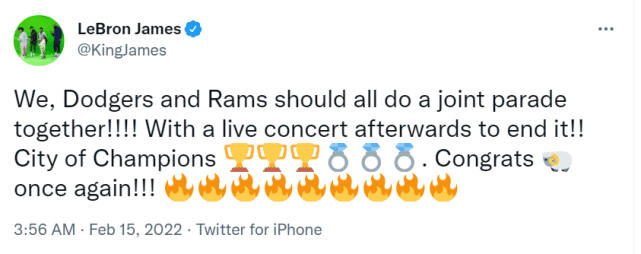 詹姆斯今天还再次发推,向公羊队表示了祝贺。昨天进行的NFL第56届超级碗,洛杉矶公羊23-20击败堪辛辛那提猛虎,时隔22年夺得队史第二冠。詹姆斯写道:“我们、道奇队和公羊队应该一起进行联合游行!然后以一场现场演唱会结束!冠军之城,再次恭喜!”2020年,湖人夺冠后因疫情未能进行夺冠游行,成为一大遗憾。