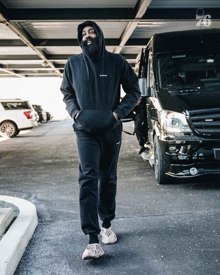 哈登身穿黑色运动裤和黑色连帽卫衣,乘坐商务车抵达76人主场,下车时哈登双手抄兜并且一脸笑容,笑得已经合不拢嘴。