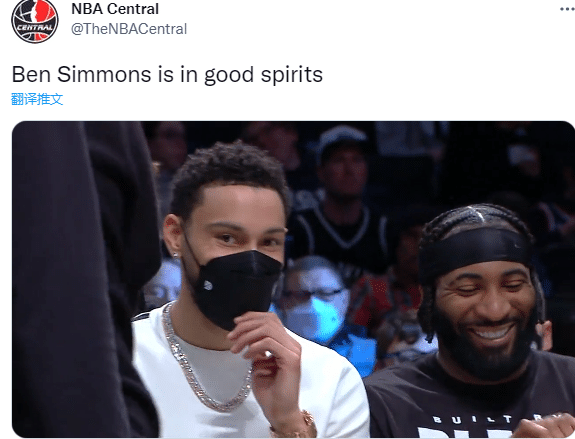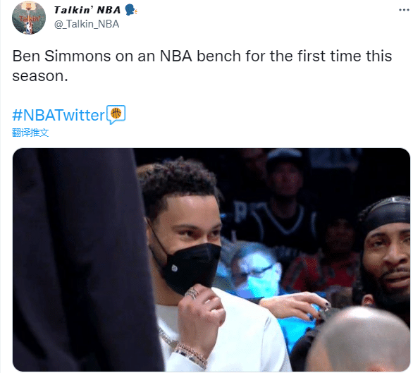 25岁西蒙斯身穿白色上衣,戴着黑色口罩坐在篮网替补席,戴着金项链和名表,这是他本赛季首次亮相替补席;西蒙斯和德拉蒙德以及其他人聊起来,有说有笑十分开心,离开76人的开心之情溢于言表。