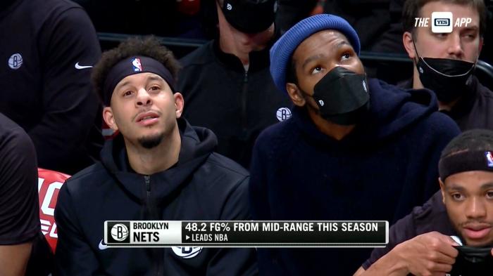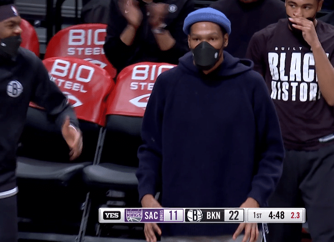 杜兰特戴着一顶蓝色针织帽,坐在场边观战,并且和小库里并肩坐在一起;今日一战,篮网第一节一度领先19分,尤其是小布朗的出色的表现,让杜兰特兴奋地坐不住,为队友激动庆祝。