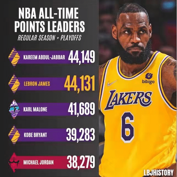 湖人和勇士大战正式开打,随着詹姆斯本场至少拿到19分,因此詹姆斯常规赛+季后赛总得分达到44152分,正式超越贾巴尔(44149分)成为NBA历史总得分第一人。