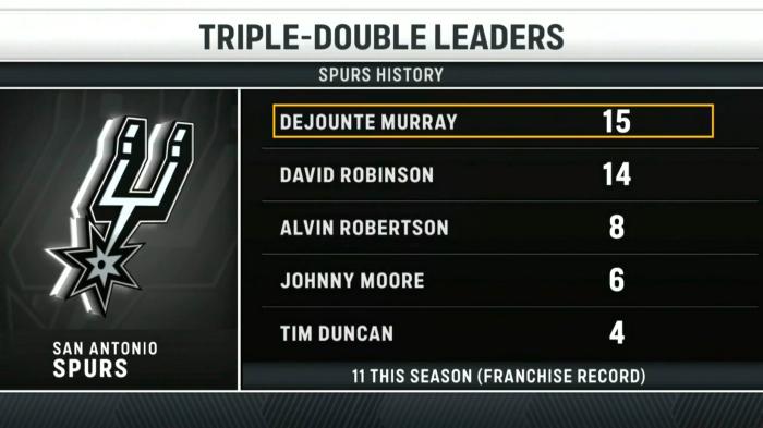 第一、穆雷成为马刺队史第一位单场轰下30+15+10三双的球员