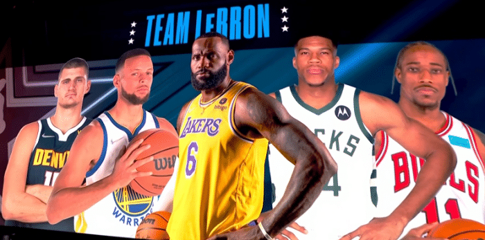 首发阵容:首选字母哥、库里、德罗赞、约基奇和詹姆斯(队长),詹姆斯队首发有4个MVP。